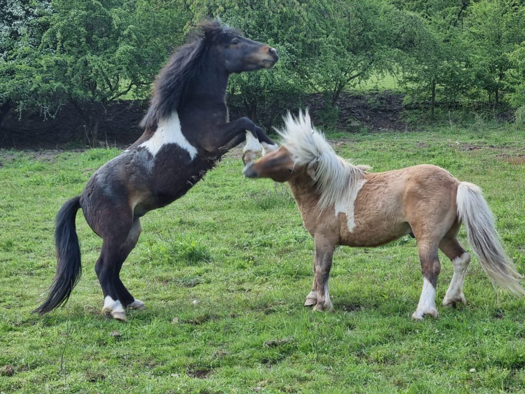 Die Deckhengste leben im Winterhalbjahr ebenfalls zusammen in einer Gruppe, was bislang recht gut klappt. Natürlich gibt es kleinere Streitigkeiten wenn die Hormone in Schwung sind, aber außer ein paar Schrammen ist nichts passiert. Während der Decksaison laufen die Hengste mit ihren Stuten zusammen, im Idealfall bis die Damen sicher tragend sind. Unsere Flächen liegen in Hessen und Thüringen, mit viel Baumbewuchs oder Sträuchern. Somit ist ein Witterungsschutz immer garantiert, und in unterschiedlichen Bodenverhältnissen trainieren sich unsere Ponys fast selbst. Für den Winter gibt es mehrere Flächen mit Hütten und/oder Weidezelten, es wurde in 60m2 großer Offenstall gebaut sowie ein Laufstall angemietet, hier ist aber in den kommenden Monaten noch viel Veränderung und Verbesserung geplant, vor allem im Bereich der Befestigung der Winterausläufe. Für Notfälle steht derzeit eine Box direkt im Haus zur Verfügung, sowie ein Weidezelt.