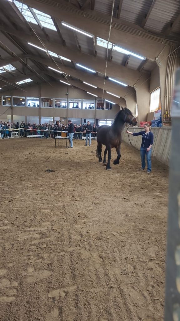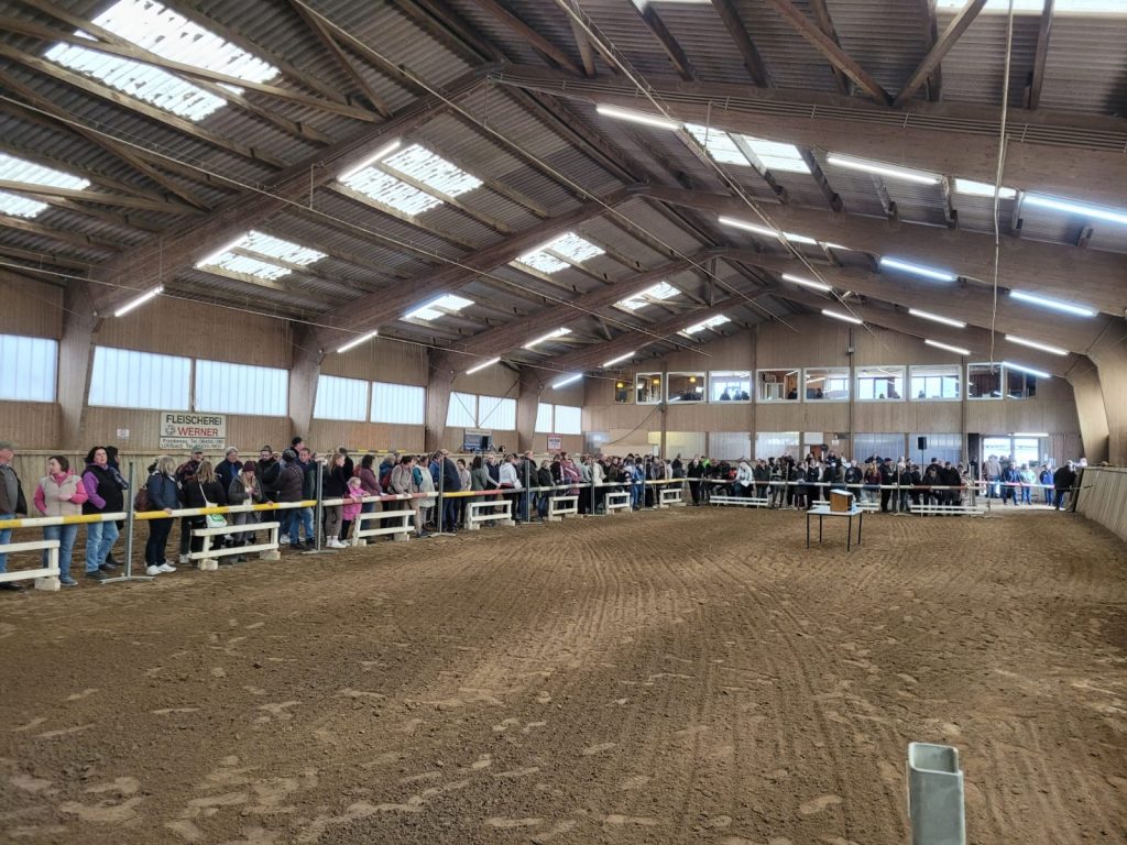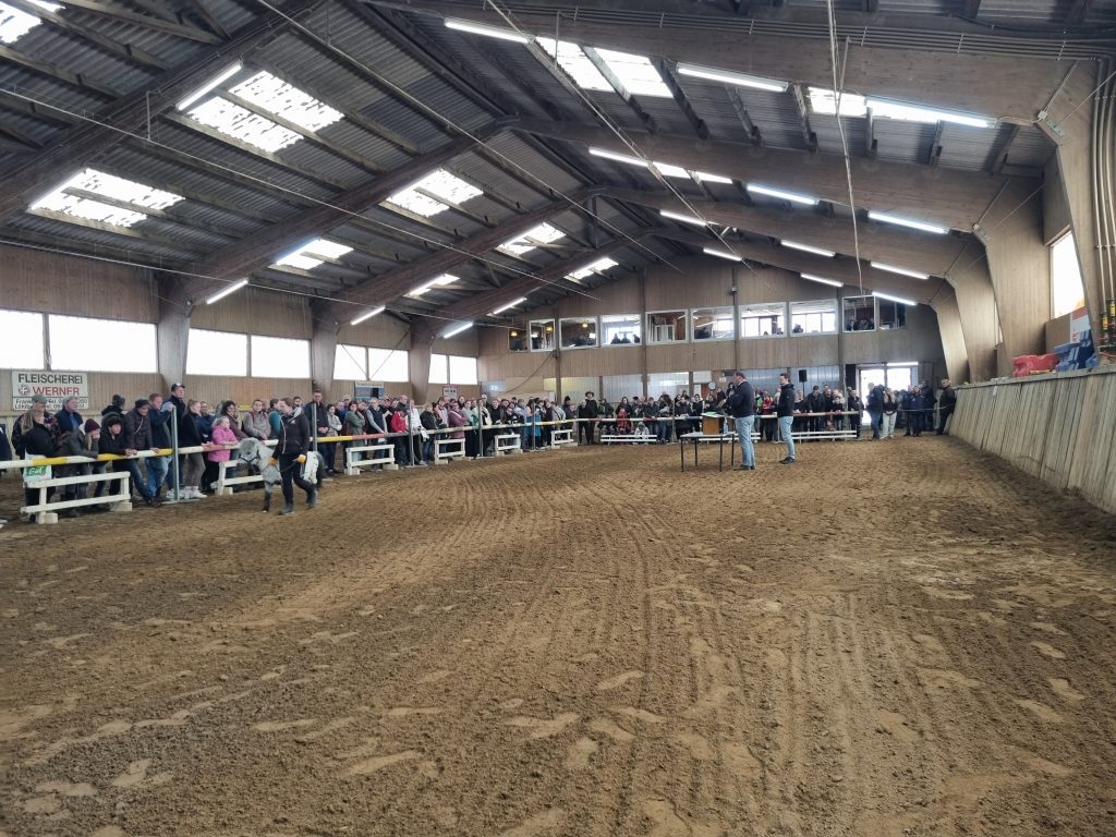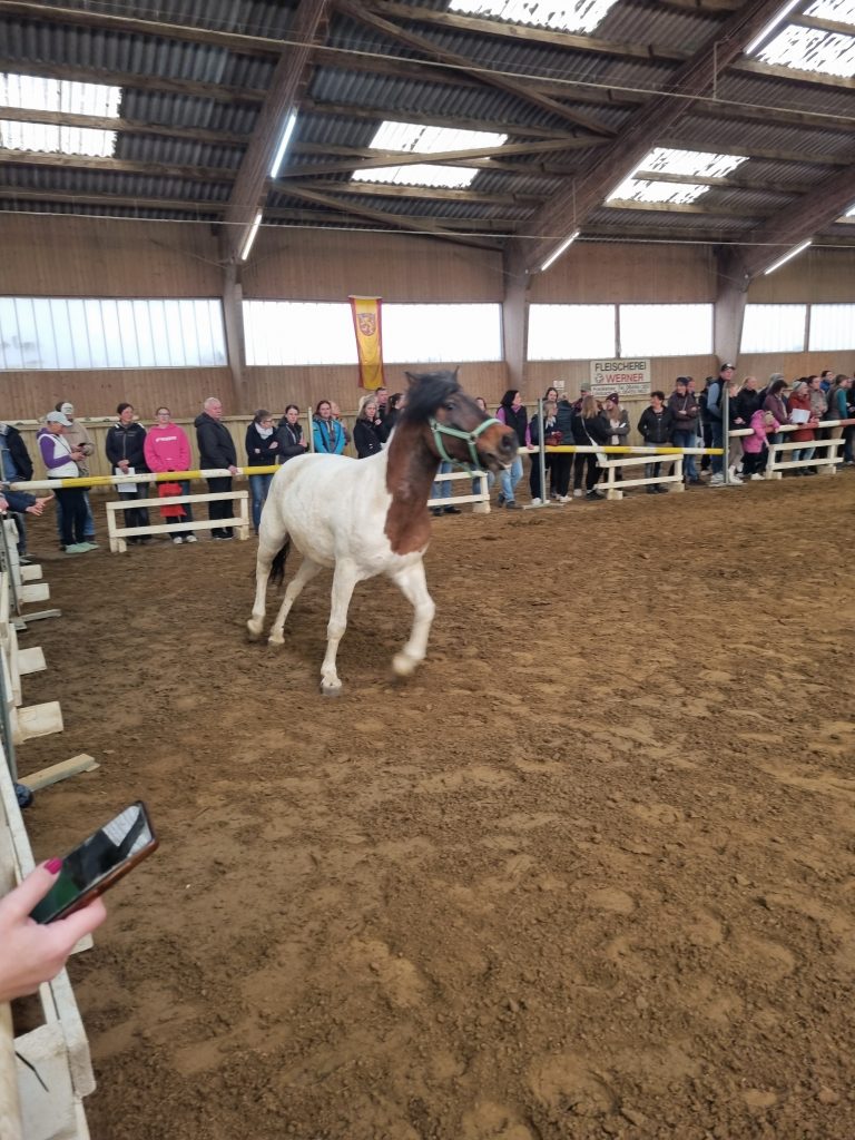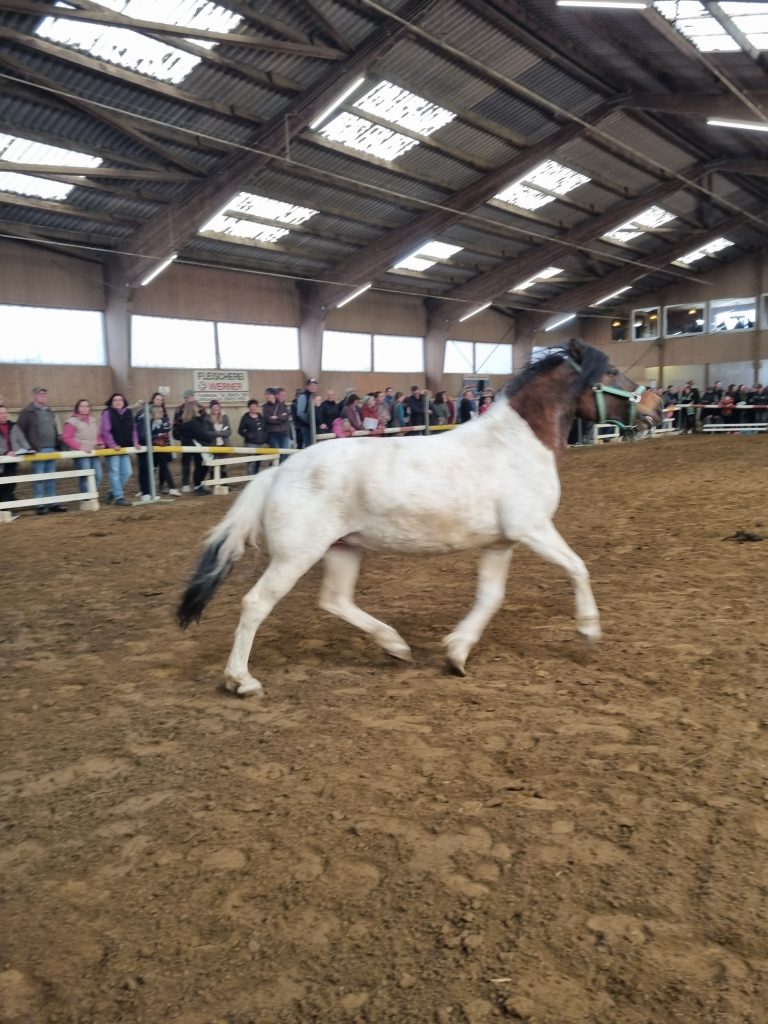 Die Shettys standen vor der Reithalle zusammen in einem Roundpen und konnten dort besichtigt werden, die größeren Ponys und Pferde sowie die Hengste waren in Boxen untergebracht. Alles ordentlich beschriftet mit Katalognummern und Infos zum jeweiligen Tier. Dabei lief alles ruhig und gesittet ab, die Tiere wirkten nicht gestresst und jeder konnte sich in Ruhe von der Stallgasse aus einen Eindruck verschaffen.
